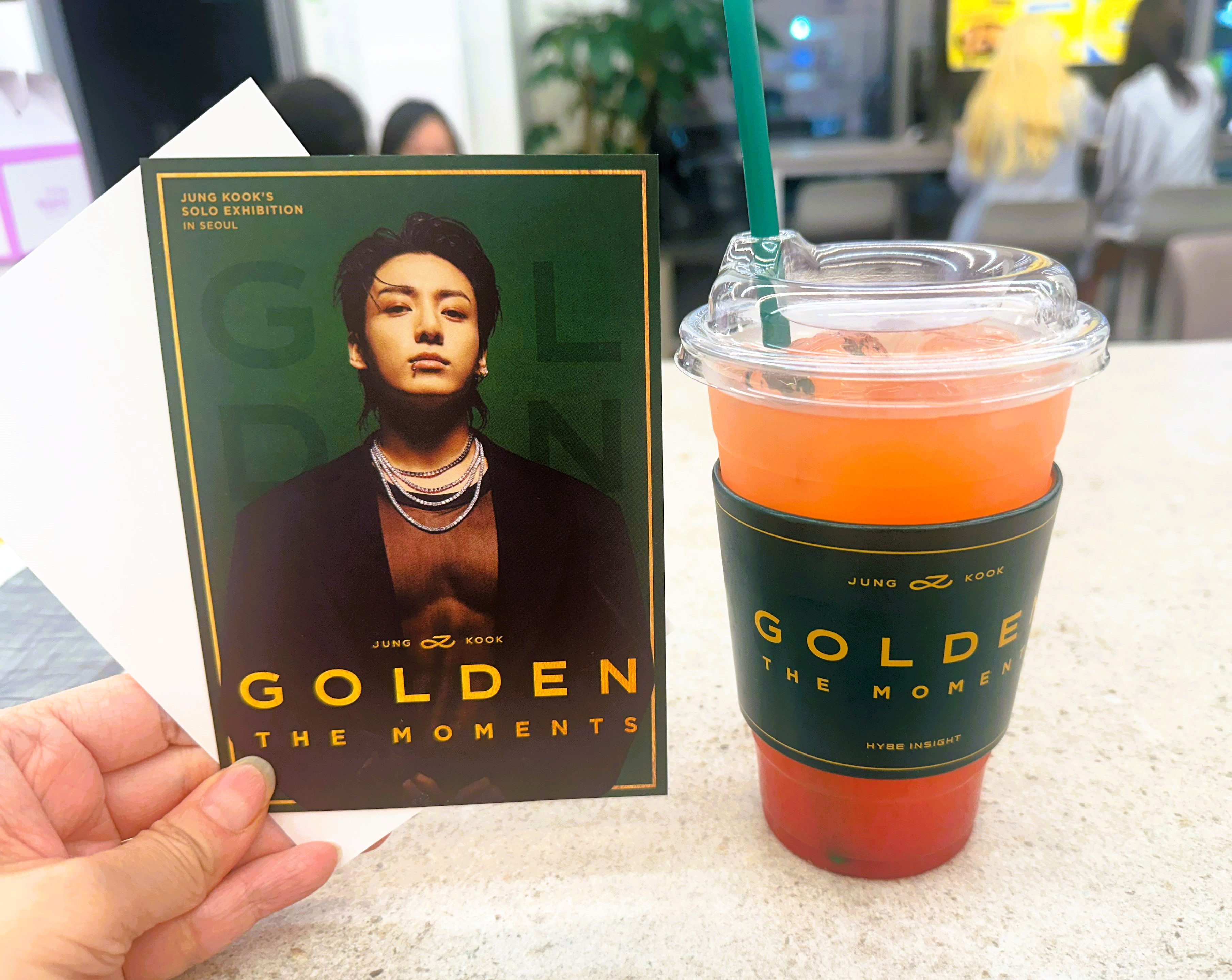 場館外有一咖啡店,跟展覽有合作,即使沒有門票,都可以入內購置飲料,然後獲得一張展覽主題的明信片及一個杯套。已經是夜晚我就點了杯桃茶。剛好那時應該是尾場觀眾看完展覽的時候,所以都看到一些粉絲買滿周邊出來喝東西。